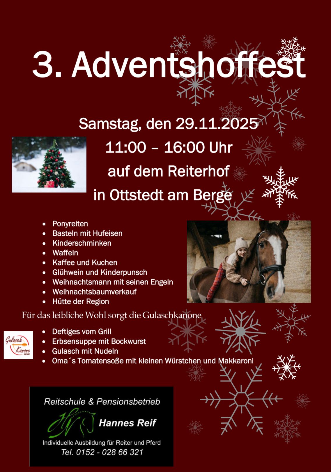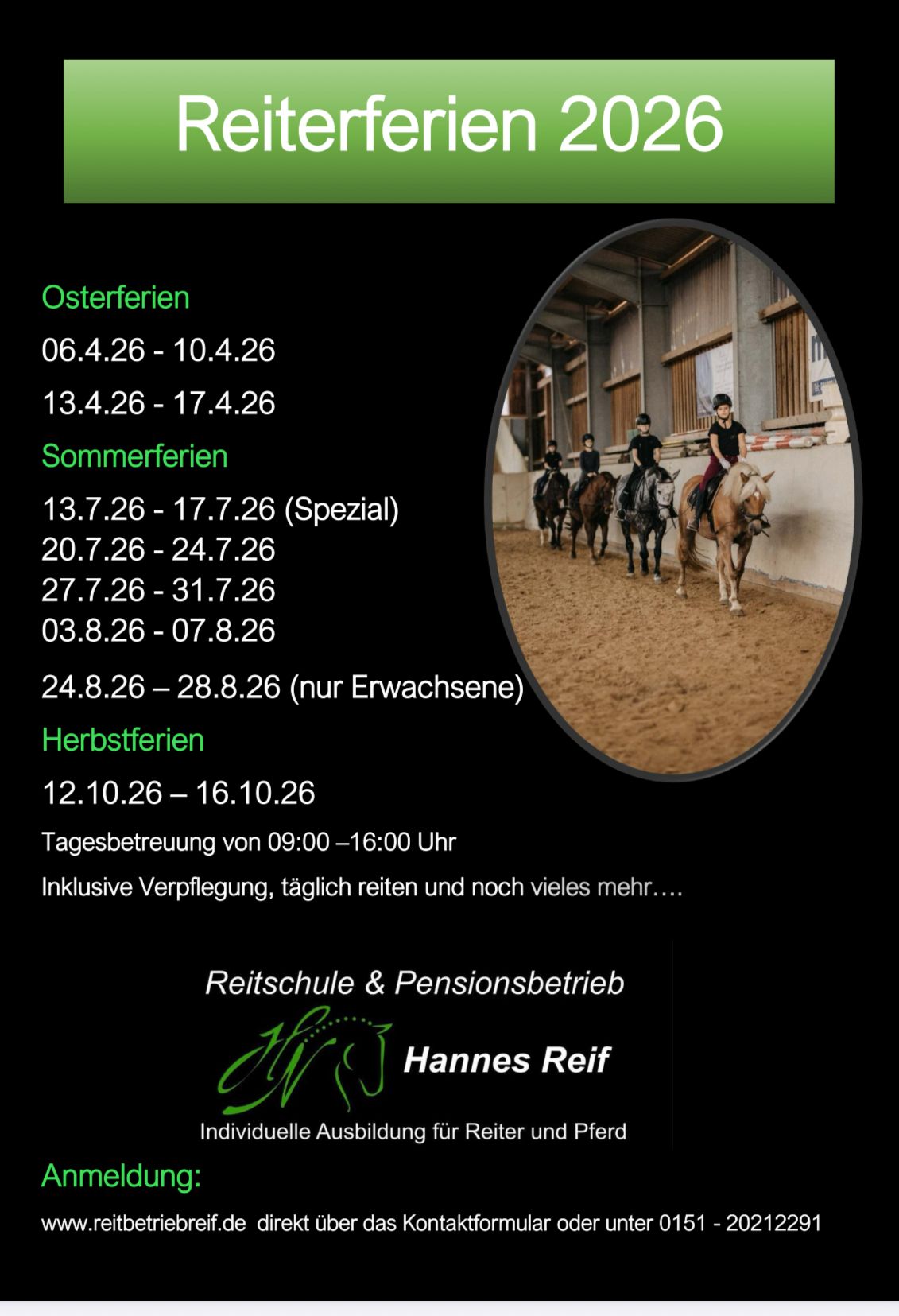 Gepostet auf Marcus BarthelTrustindex überprüft, ob die Originalquelle der Bewertung Google ist. Ein wundervoller Ort, an dem Kinderaugen leuchten können. Vielen Dank Hannes und Nadine !Gepostet auf Enrico WagnerTrustindex überprüft, ob die Originalquelle der Bewertung Google ist. Super Typ und gutes Team. Den Pferden geht es Wunderbar und der menschliche Umgang ist klasse. Kann ich äußerst empfehlen.Gepostet auf Simon WolfTrustindex überprüft, ob die Originalquelle der Bewertung Google ist. Herr Reif ist super sympathisch und macht einen tollen Job. Große Empfehlung für alle Familien mit Kindern, die eine schöne und stressfreie Zeit zusammen verbringen wollen oder ihren Kindern tolle Erlebnisse wünschen.Gepostet auf Kai KazimTrustindex überprüft, ob die Originalquelle der Bewertung Google ist. Super Sympathischer Chef. Macht einen tollen Job!!!Gepostet auf SanniTrustindex überprüft, ob die Originalquelle der Bewertung Google ist. Unser 7 Jahre altes Pferdemädchen hat ihre ersten Sommerferien bei Hannes, Nadine und dem tollen Team verbracht. Sie hat sich sehr wohl gefühlt, viel gelernt und jede Menge Spaß gehabt. Egal ob Reitstunden für groß und Klein, Reiterferien und Kindergeburtstage, bei Hannes und Nadine sind alles Pferdeliebhaber und Liebhaberinnen in sehr guten Händen🐴 Wir kommen sehr gerne wieder.Gepostet auf m lTrustindex überprüft, ob die Originalquelle der Bewertung Google ist. Mein Pferd steht nun seit fast einem Jahr im Pensionsbetrieb von Hannes Reif & ich bin nach wie vor sehr glücklich darüber, dass mein Pferd an diesem wunderschönen Platz stehen darf. Die Stallgemeinschaft ist unglaublich lieb & freundlich, man wird super aufgenommen & fühlt sich gleich zu Hause & wohl. Sowas habe ich noch nie in einem anderen Stall erlebt. Der Zusammenhalt & die Freundlichkeit untereinander sind einmalig. Der Stall ist groß & luftig, die Koppeln weitläufig und einfach idyllisch in einer großen Gruppe. Die Pferde werden sehr gut vorsorgt und es wird auf individuelle Befindlichkeiten des Pferdes eingegangen, in der Woche, am Wochenende & Feiertag. Rundum ein kompletter Service, der dem Pferdebesitzer keinen Raum für Sorgen lässt. Der Service ist einfach spitze. Auch jetzt, nachdem mein Pferd operiert werden musste, wird auf die spezielle Situation eingegangen, sich gekümmert & Möglichkeiten geschaffen, damit es für das Pferd so stressfrei wie möglich ist. Dafür bin ich unendlich dankbar und kann den Stall wärmstens empfehlen. Auch der Reitunterricht ist toll und es wird auf den persönlichen Stand eingegangen & zum Beispiel beim Anfänger Springtraining mit Ruhe an die Sache und Unsicherheiten herangegangen. Im Umkreis vom Weimarer Land für mich einfach der beste Stall.Gepostet auf Peter DetschTrustindex überprüft, ob die Originalquelle der Bewertung Google ist. Seit 3 Monaten nehme ich Reitunterricht bei Nadine und Hannes Reif. Ich freue mich jedesmal, wenn die nächste Reitstunde ansteht. Neben der Professionalität von Hannes und Nadine verstehen sie es sehr gut, auch die Freude und den Spass am Reiten zu vermittlen. Und ich glaube, meine Fortschritte können sich sehen lassen :-). Danke!!Gepostet auf Jasmin WeichmannTrustindex überprüft, ob die Originalquelle der Bewertung Google ist. Im August diesen Jahres kauften wir unseren Traum bei Nadine und Hannes Reif. Unser Pferd Rosi. Wir zogen in die Pferdepension ein und nehmen Reitunterricht. Wir bekamen mit diesem Schritt ein Pferd, ein "Zuhause" für unser Pferd und uns und mit dem Team der Reitschule & Pensionsbetrieb Hannes Reif Experten, die uns als Anfänger stets mit Rat und auch viel Tat zur Seite stehen. Die Reitstunden sind für mich immer ein Erlebnis. Einerseits merke ich jedes mal meine Fortschritte, andererseits macht die Art und Weise, wie die Reitlehrer und Reitlehrerinnen ihr großes Wissen an mich weitergeben einfach großen Spass. Und ja, auch mein Pferd bekommt nochmal von der Reitschule durch professionelle Bereitung den letzten Schliff, damit ich als Anfängerin bald unbesorgt losreiten kann. Für alle Pferdebegeisterten können wir die Reitschule & Pensionsbetrieb Hannes Reif bestens empfehlen. PS: auch unsere kleine Tochter hat nun mit 5 Jahren ihre ersten Ponyrunden gestartet.Gepostet auf Steffi und Thomas GrießTrustindex überprüft, ob die Originalquelle der Bewertung Google ist. Super freundliches Team! Sehr guter Umgang mit Pferd und Reiter👍Gepostet auf Carmen KramerTrustindex überprüft, ob die Originalquelle der Bewertung Google ist. Kann ich nur weiterempfehlen. Die Kinder werden wirklich gut betreut!