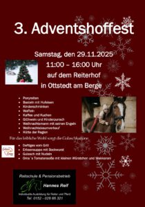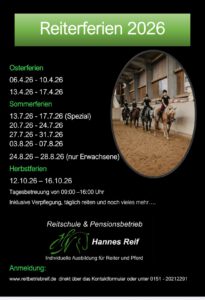 Seit 2020 führen wir die Reitschule & Pensionsbetrieb Hannes Reif. Hier finden Sie alles, was Reiterin und Reiter sich wünschen. Interesse uns kennenzulernen? Dann können Sie sich hier informieren. Oder besser, kommen Sie direkt auf uns zu. Über eine Kontaktanfrage hier oder bei uns in Ottstedt. Wir freuen uns.