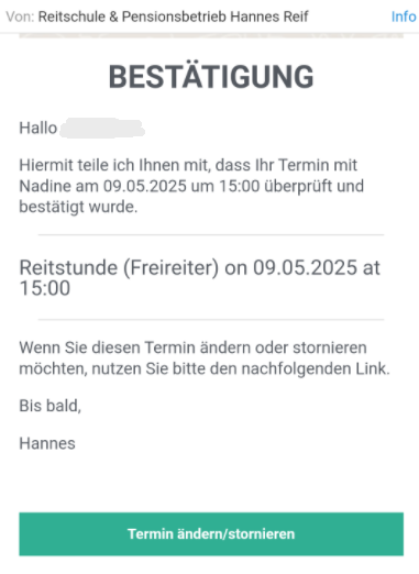 Solange die gebuchte Reitstunde noch nicht im Google-Kalender eingetragen ist, genügt es, die Reitstunde über das Buchungssystem zu stornieren. Gehen Sie dazu in die Buchungsbestätigung, die Sie in Ihrer bei der Buchung eingetragenen E-Mail-Adresse erhalten haben. Hier klicken Sie auf den Button „Termin ändern/stornieren“