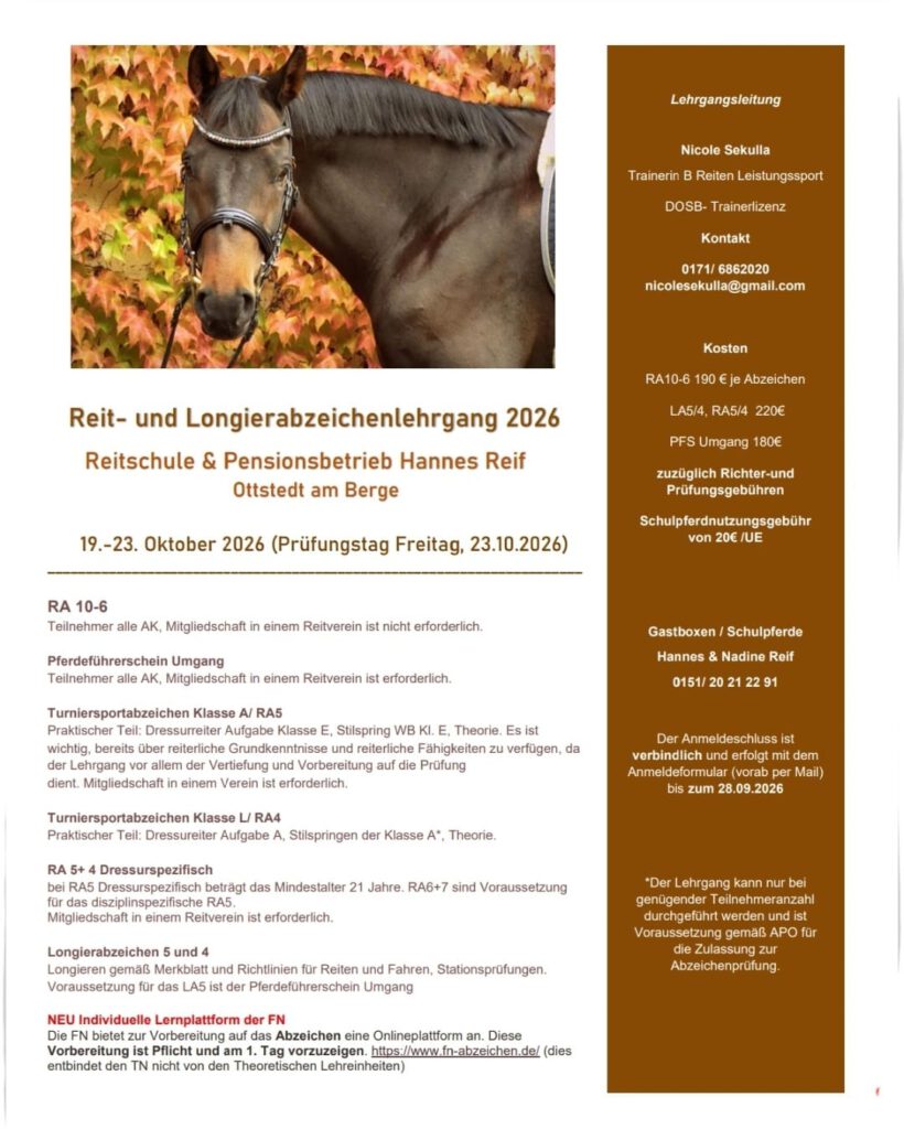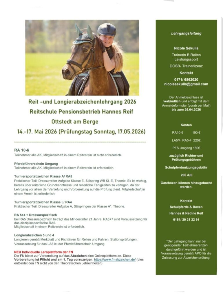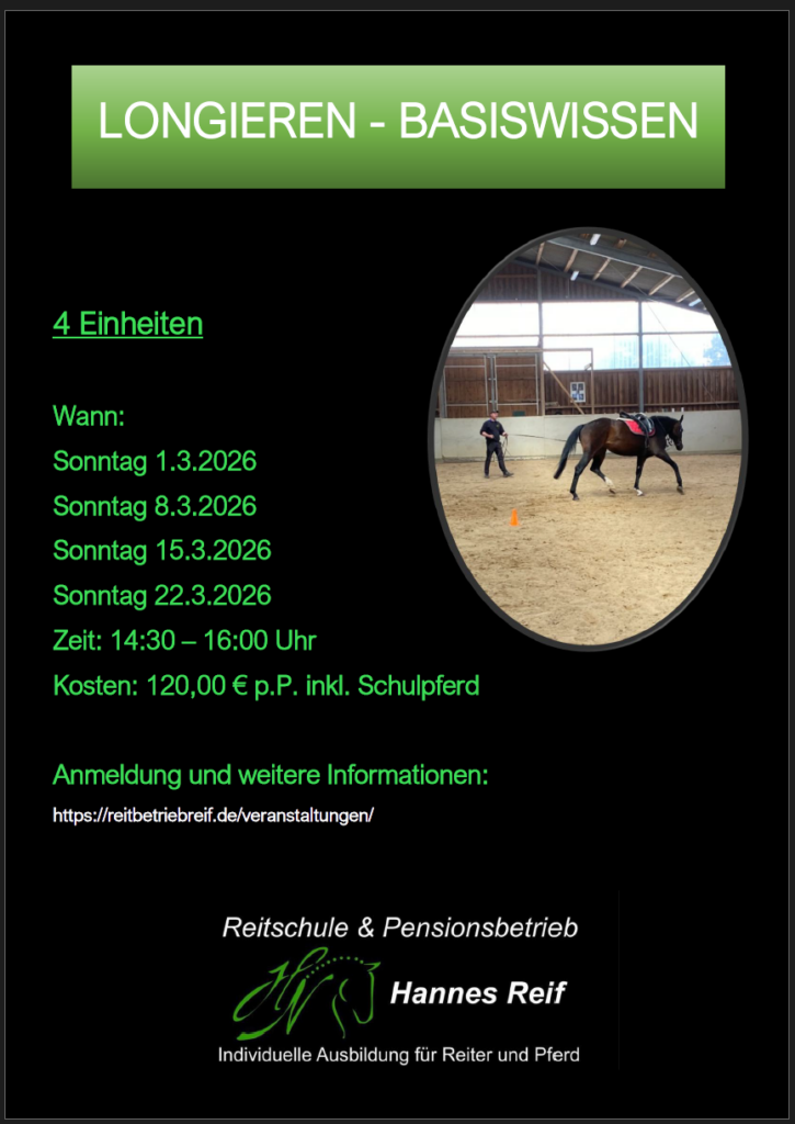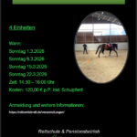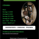 | 2-Tageslehrgang / 1UE pro Lehrgangstag á 45 min inkl. Theorie am Vorabend | 250 € /aktiver Teilnehmer mit Pferd |